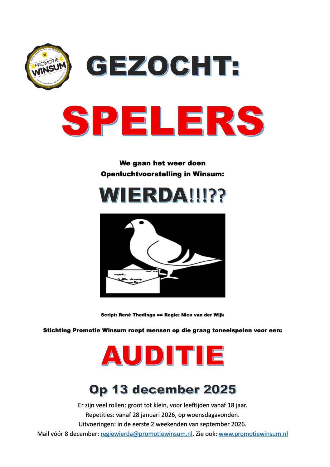 Stichting Promotie Winsum roept mensen op die graag toneelspelen om 13 december 2025 auditie te doen voor Wierda!!!??